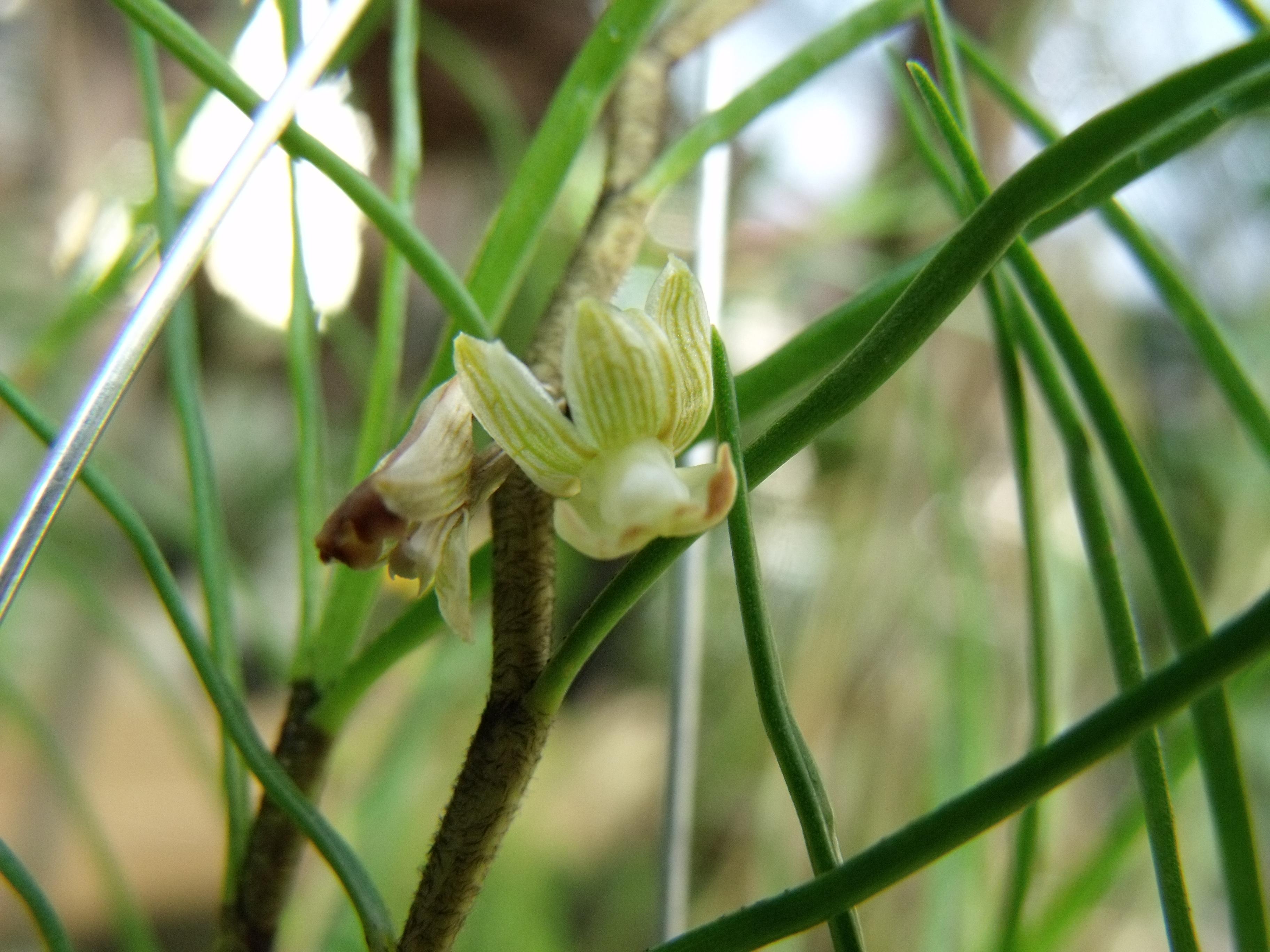 Mô tả: Lan sống phụ sinh, thân mảnh, dài đến 1m, buông xuống. Lá thuôn hẹp dạng kim, dài 6 - 10cm, đầu nhọn. Cụm hoa có 2 - 4 hoa, màu xanh vàng với gân màu nâu. Cánh môi thuôn dài, rộng ở đỉnh có 3 thùy, hai thùy bên tròn nhỏ, thùy giữa thuôn có đỉnh hơi lõm, mép màu vàng xanh, ở giữa màu trắng, cựa dài.