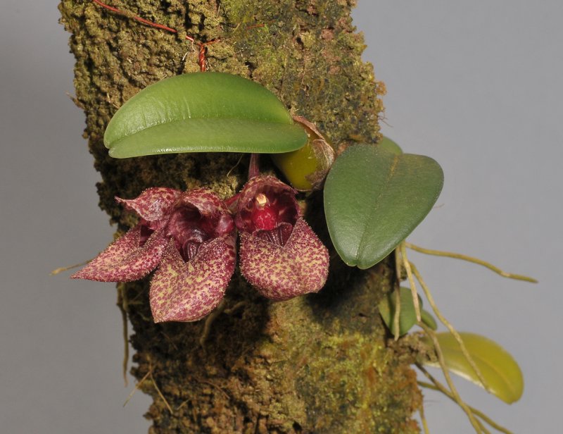 Mô tả: Lan sống phụ sinh, thân rễ dài. Củ giả xa nhau, hình cầu có cạnh, đường kính 1 - 2cm, đỉnh có một lá. Lá dày, thuôn, đầu có 2 thùy nông, dài 3 - 4,5cm. Cụm hoa mọc từ gốc củ giả, mằn ngang theo thân rễ. Hoa lớn 2 - 4cm màu tía có đốm đỏ. Cánh đài bên dính nhau ở đầu. Cánh môi hình tam giác, màu đỏ sậm như đen.