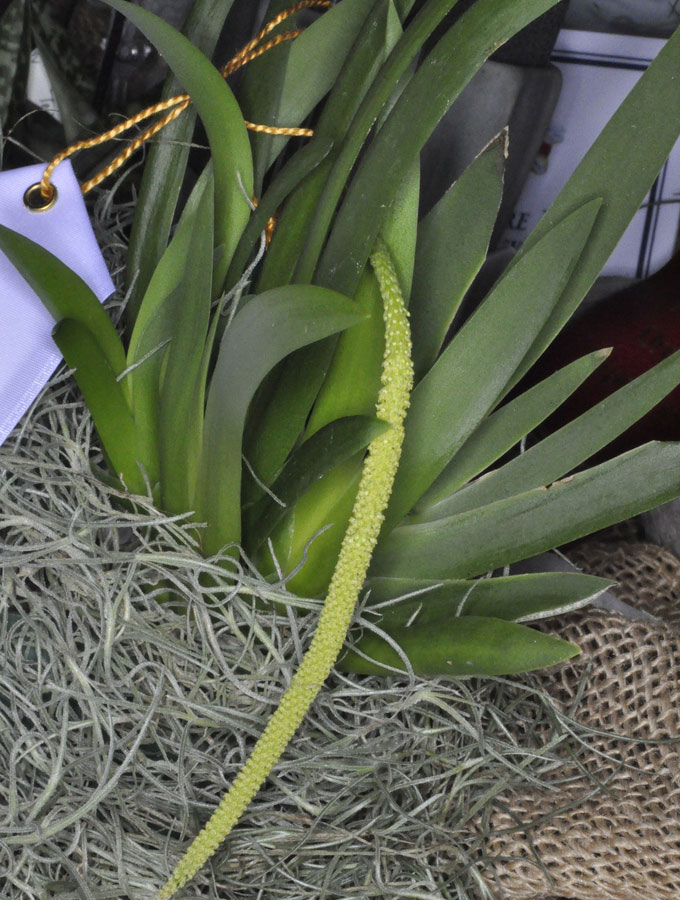 Mô tả: Phong lan có thân rất ngắn, mang 4-6 lá hình dao, to đến 6 x 1cm, có đốt ở gốc. Chùm hoa dày đứng, dài đến 20cm; hoa đính thành vòng, màu lục với môi cam; phiến hoa toả hay cong xuống, cánh hoa xoan rộng, môi xoan, mép rìa có răng to, đầu lõm thành 2 thuỳ nhọn, rẽ ra.